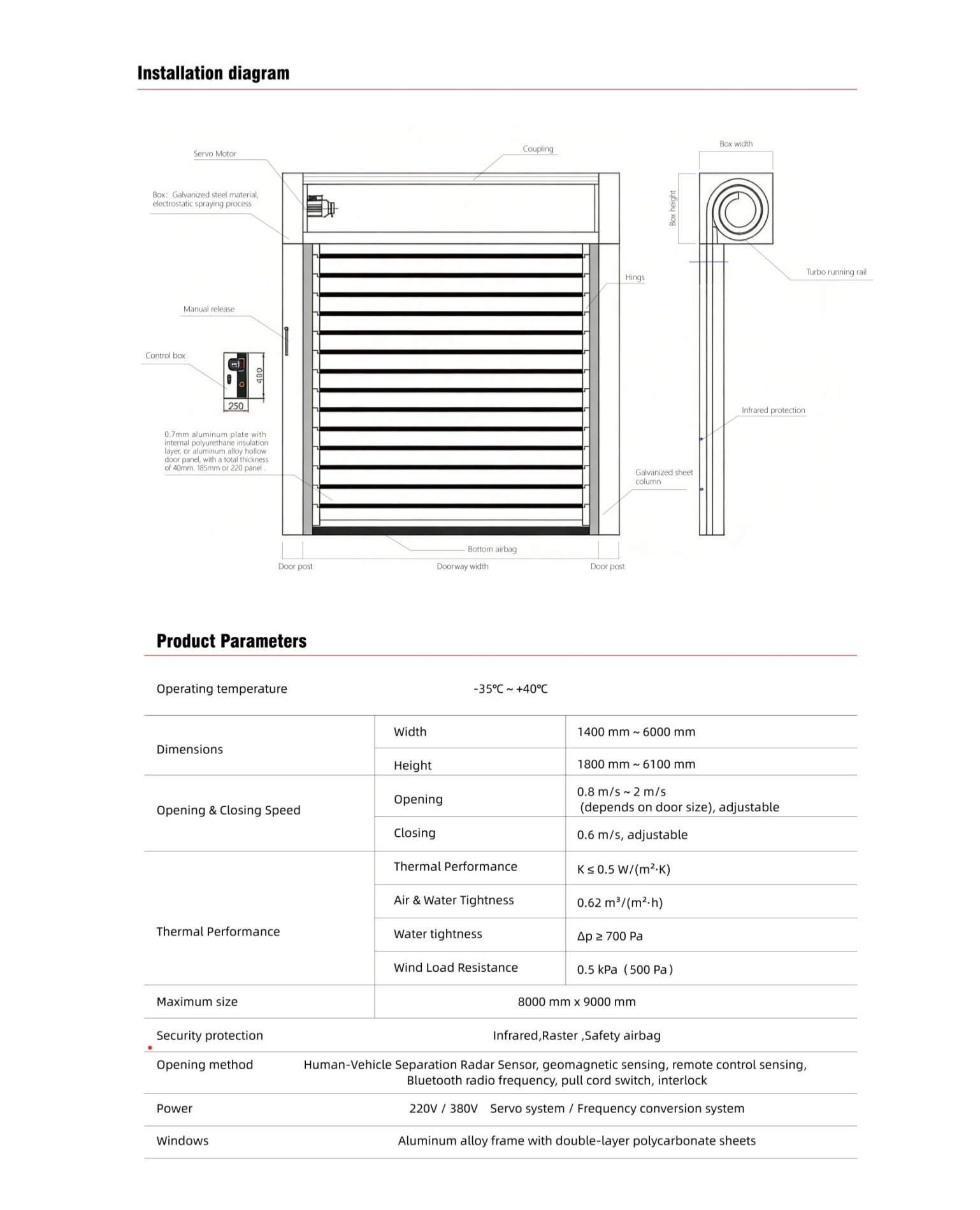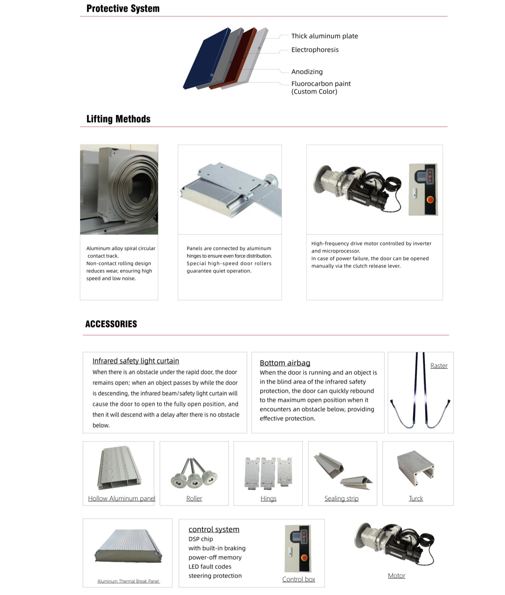 Crafted with high-quality 6063-T13 aluminum alloy, it features a fast-response motor and offers lightweight, high-speed sectional lifting or turbine lifting. Boasting easy installation and maintenance, it excels in wind resistance and pressure resistance, making it ideal for commercial spaces such as factories, workshops, and cargo storage warehouses.