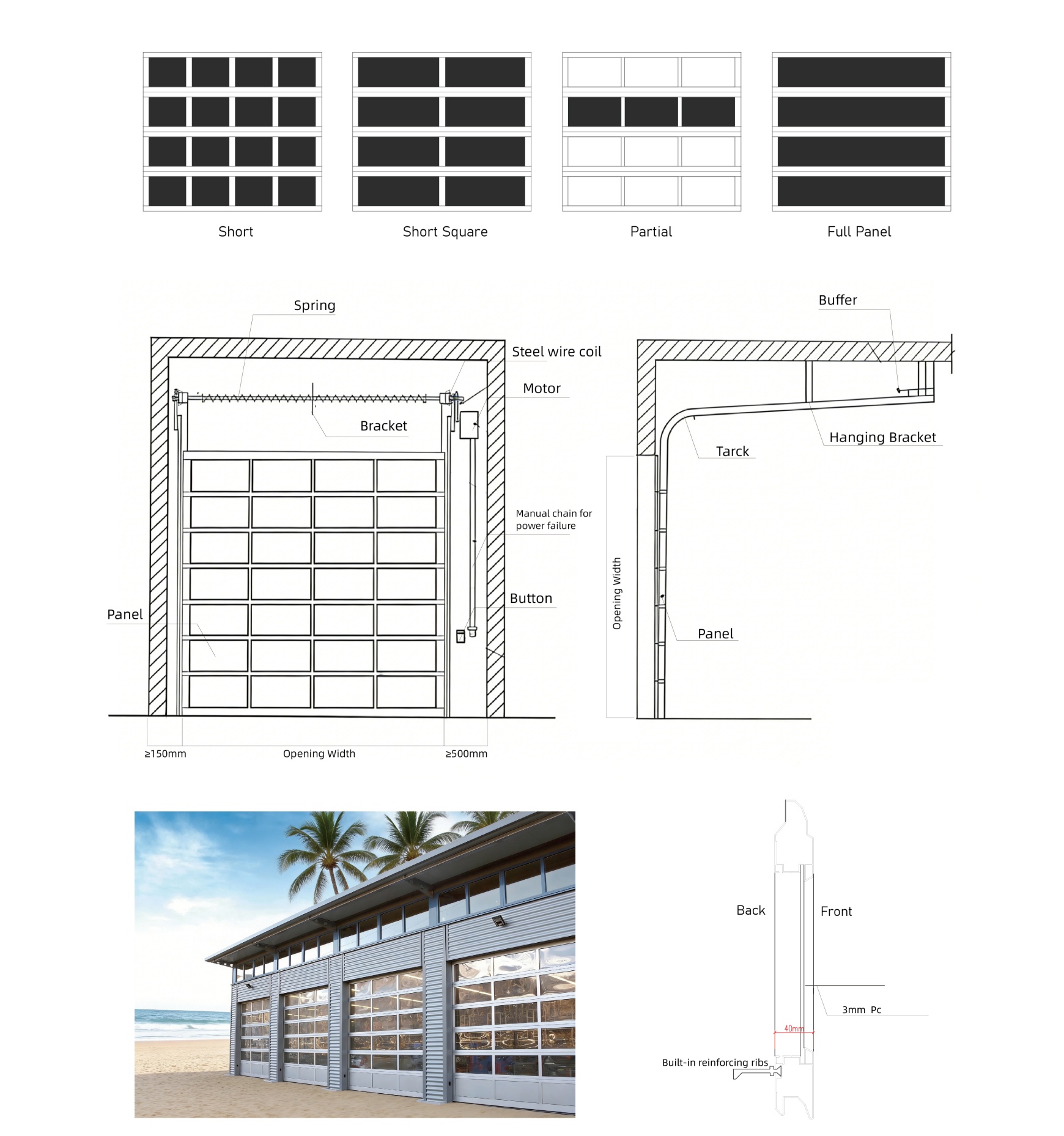 Constructed from premium 6063-T6 aluminum alloy paired with tempered glass panels, offering four tinted glass options. Features a polyurethane insulation layer on the rear for enhanced thermal performance. Boasts a sleek, timeless design with easy installation and maintenance. Utilizes a segmented upward sliding mechanism to maximize garage space efficiency.