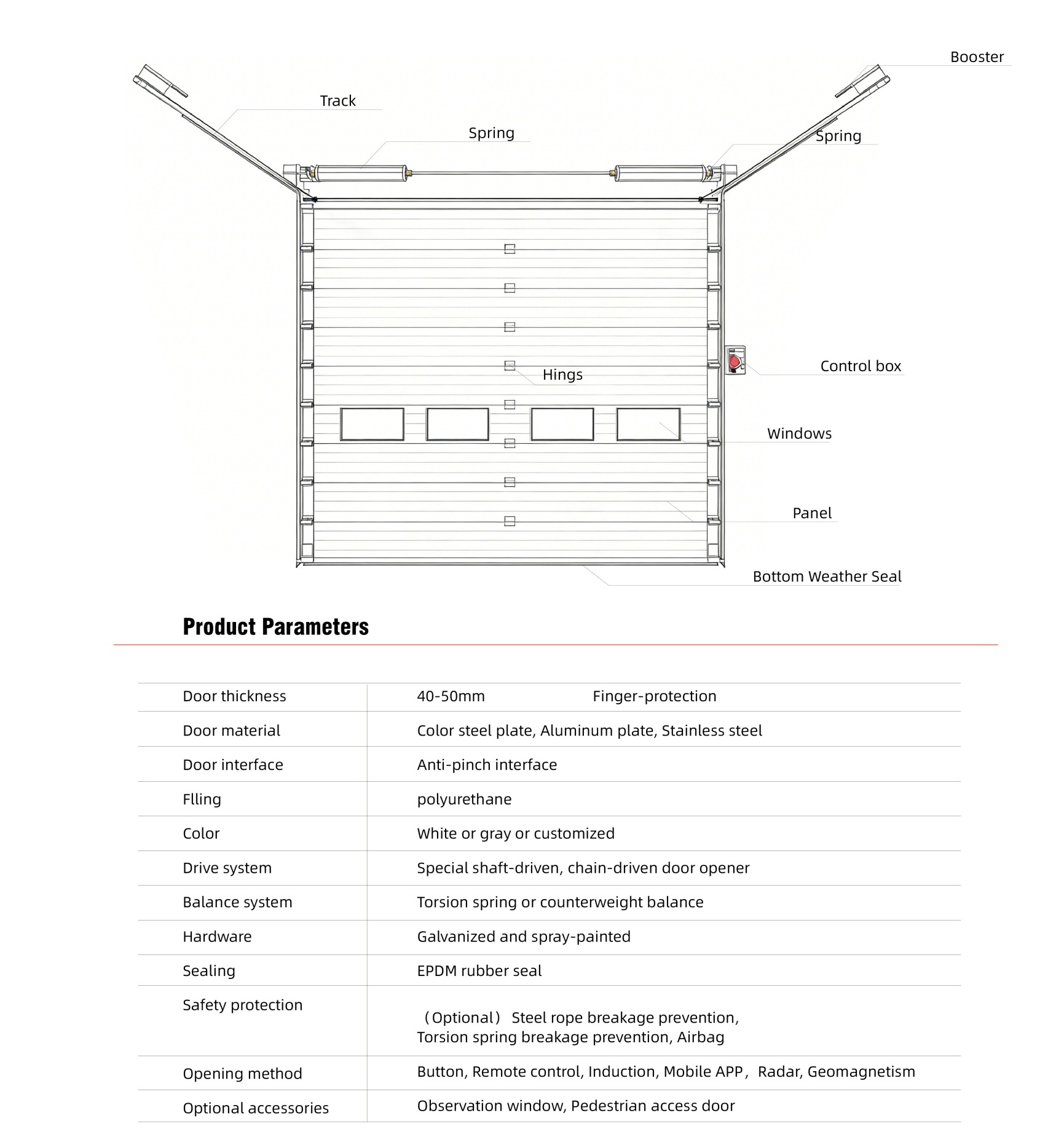 Constructed with durable, low-maintenance double-sided steel panels filled with polyurethane foam, offering lightweight yet high-strength performance. Sections lift upward vertically or rest atop buildings for easy installation and maintenance. Features strong wind and pressure resistance, suitable for commercial spaces like factory workshops and goods storage warehouses. Adaptable to diverse climates across Europe, America, and Central Asia—including dry, sandy regions—and withstands extreme weather such as typhoons and blizzards.