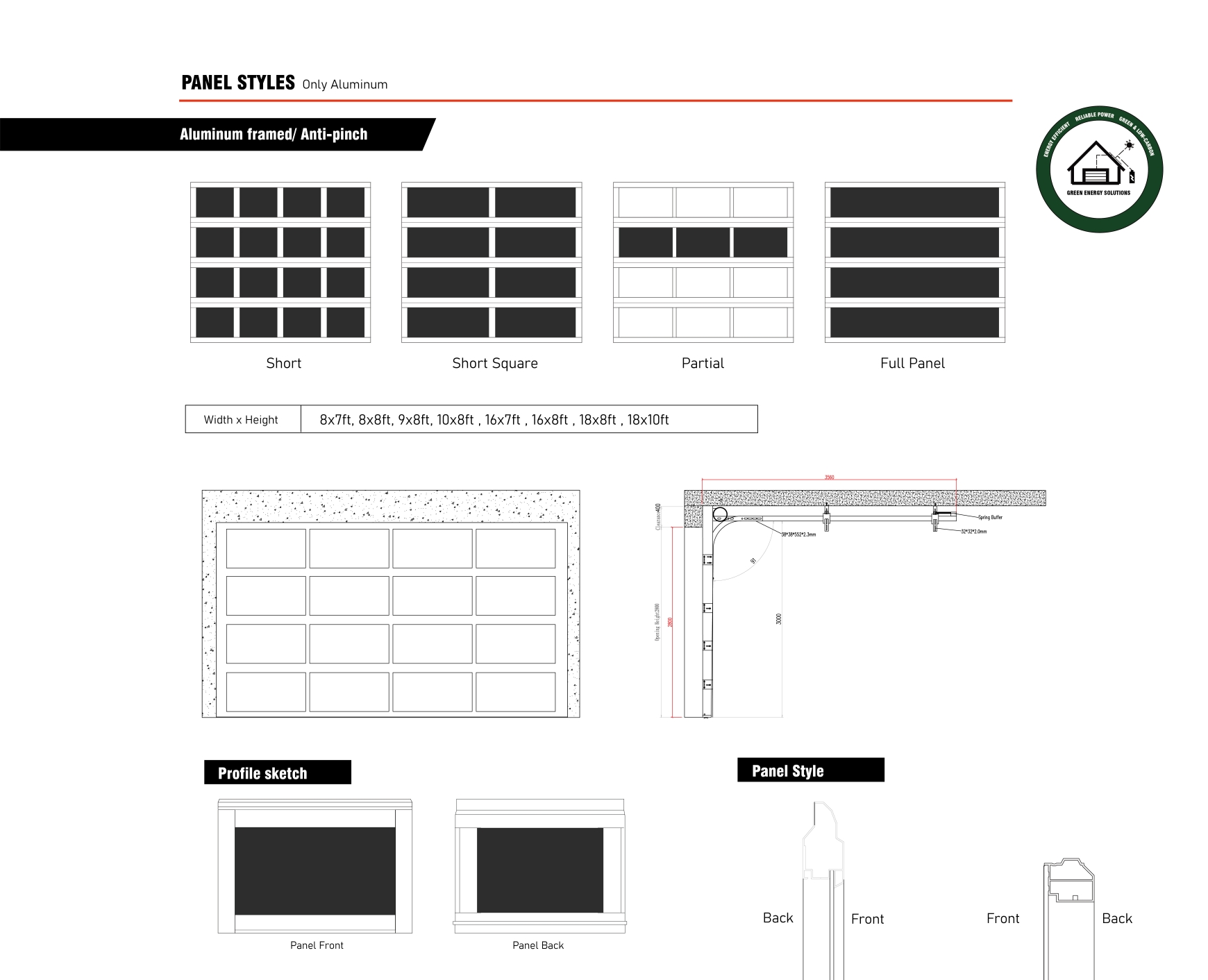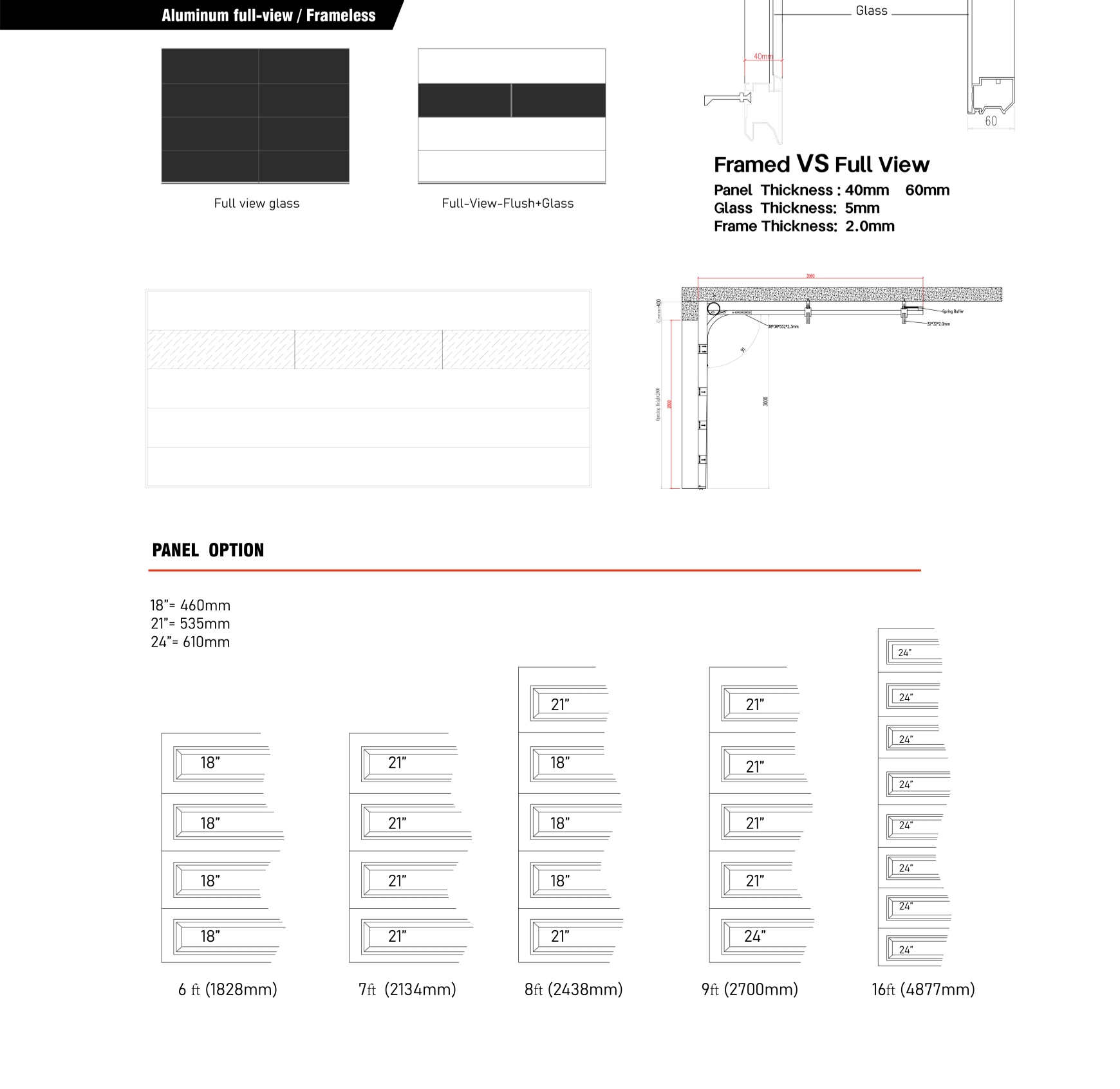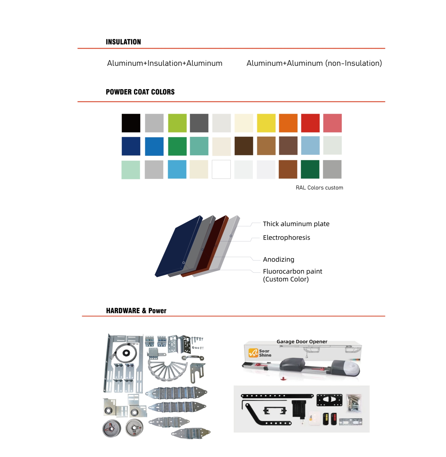 Constructed from premium 6063-T6 aluminum alloy or steel frames, featuring flat glass, frosted glass, or tempered glass panels for easy installation and maintenance. Sectional upward sliding design maximizes garage space efficiency.